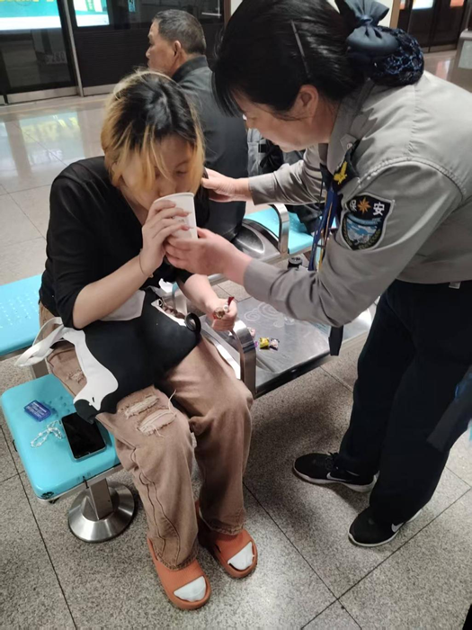 正在巡视站台的队长王丽霞听到呼叫,第一时间赶往现场。凭借多年地铁工作积累的经验,王丽霞迅速判断女乘客可能是低血糖症状。王丽霞单膝跪地,用手抱起昏迷不醒的女乘客,将其抱到休息区座椅上。随后,王丽霞通过对讲机,呼叫同事送来糖果和温开水。
