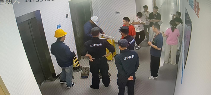 演习模拟了员工在乘坐电梯时,电梯突发故障导致人员被困的场景。被困员工迅速按下轿厢内的紧急呼叫按钮向监控室求救。监控室值班保安接到报警后,立即核实被困人员位置、人数等信息,一边安抚被困人员情绪,告知其保持冷静、不要惊慌、切勿强行扒门,一边迅速通知应急救援小组赶赴现场救援,并第一时间联系电梯维保单位。