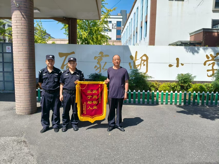 市民朱先生接受治疗后身体康复,几日后,专程来到百家湖小学,亲手为保安队员蔡其亮、蒋开军送上了一面印有“爱岗敬业,乐于助人”的锦旗,以示感谢!