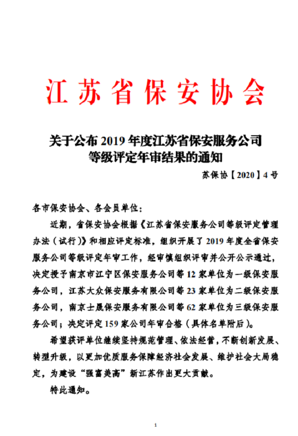 关于公布2019年度江苏省保安服务公司等级评定年审结果的通知