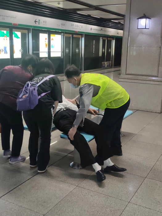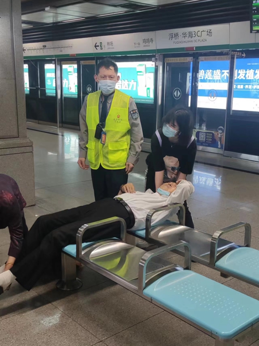 三分钟后,列车抵达浮桥站,王连才与接应的保安队员一同将患病乘客搀扶下车,安置在休息区的躺椅上,并拨打120急救电话。