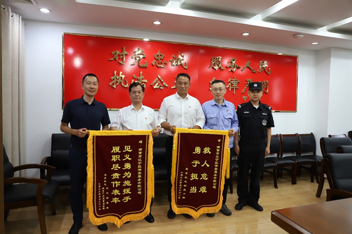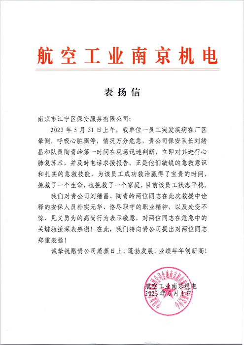 6月5日,中国航空工业集团公司金城南京机电液压工程研究中心领导专程来到江宁保安公司,亲手送上表扬信和锦旗,对驻点保安队长刘绪昌、保安队员陶青岭见义勇为的行为进行表扬。