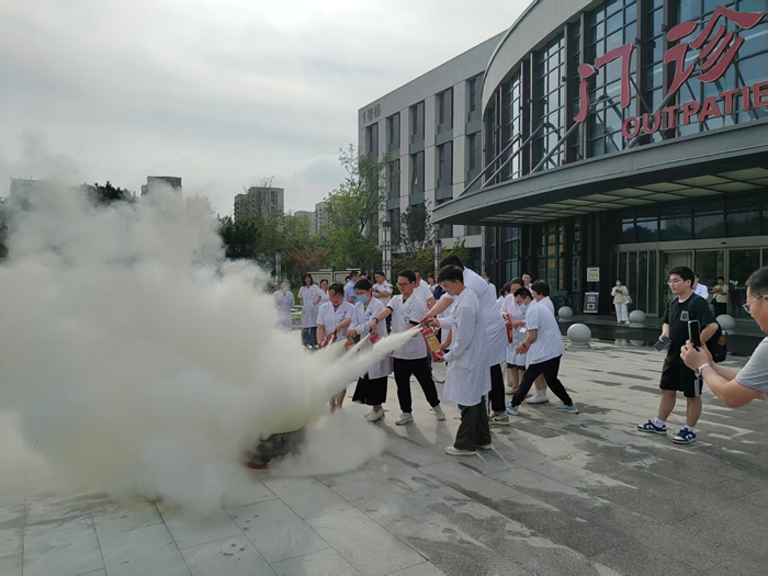 灭火实操环节中,保安队长范其组织医护人员分组练习干粉灭火器使用。他亲自示范“提、拔、握、压”四字口诀,强调对准火源根部喷射的关键技巧,参训人员逐一上手实操。现场还模拟了消防栓使用和水枪喷射场景,通过“真枪实弹”的训练,进一步强化了“小火自救、大火协同”的应急处置能力。